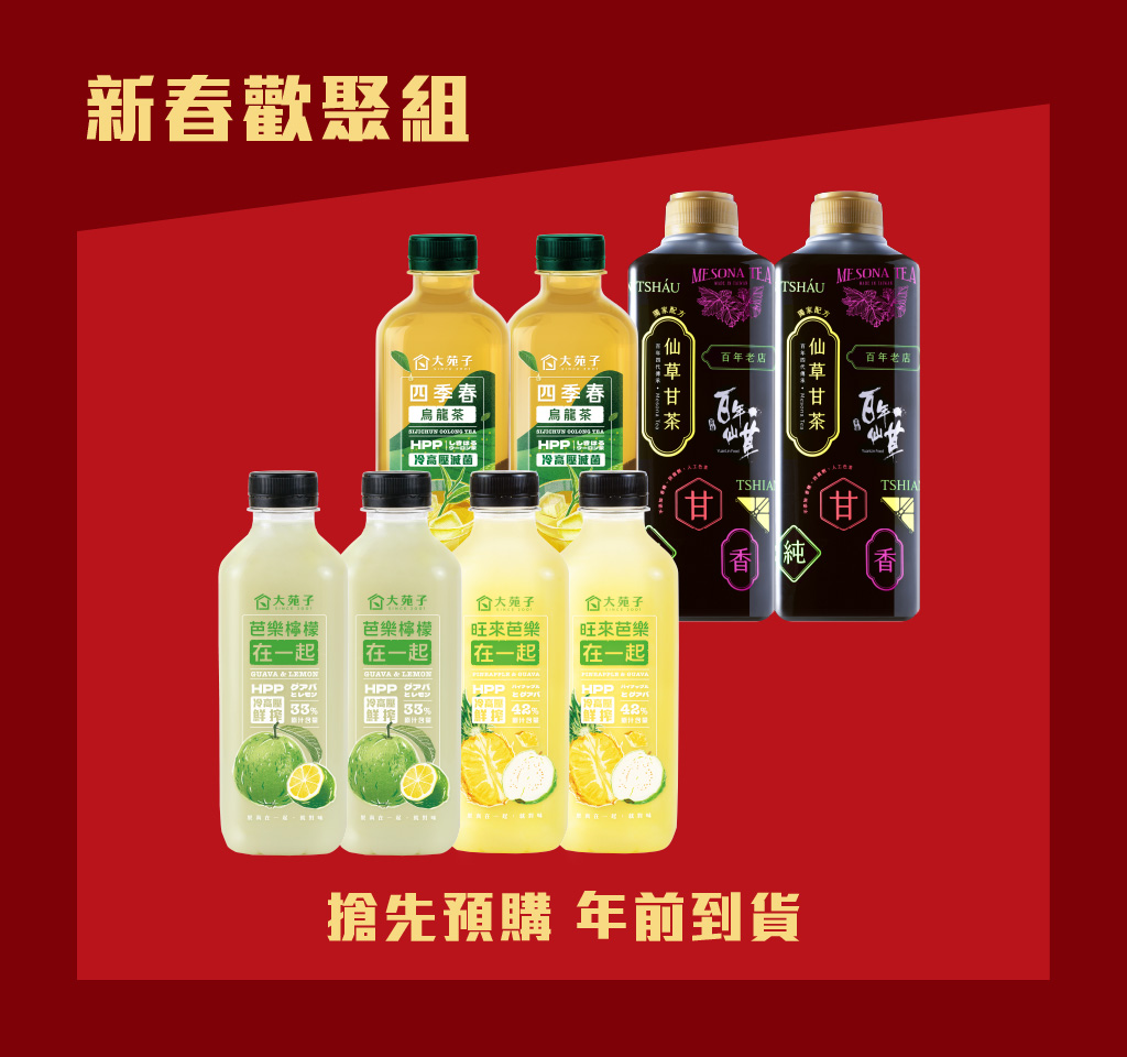 【預購-新春歡聚組】 芭樂檸檬在一起 850mL x2 旺來芭樂在一起 850mL x2 四季春烏龍茶 850mL x2 百年仙草 仙草甘茶 960mL x2