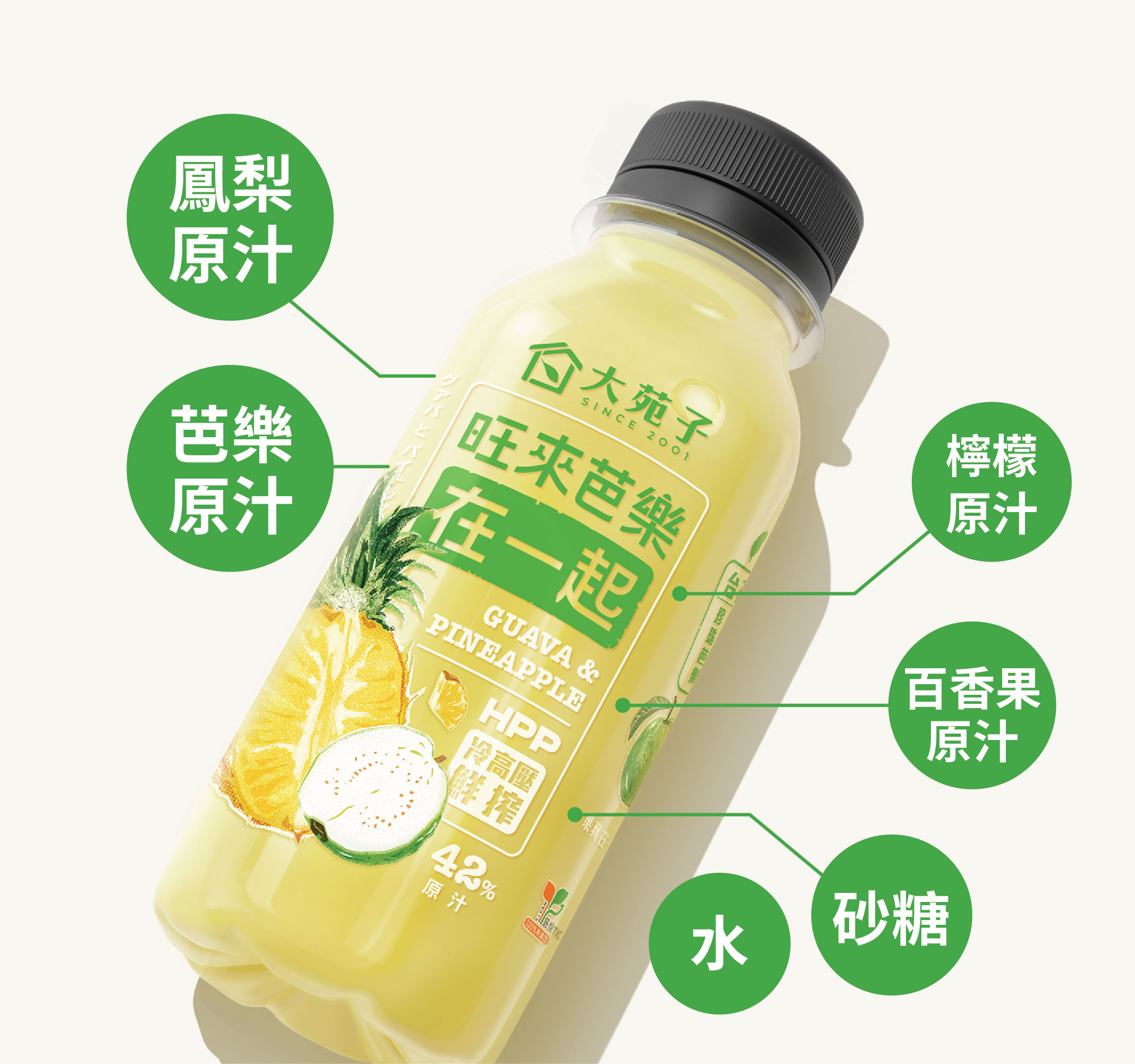 水、鳳梨原汁、芭樂原汁、砂糖、百香果原汁、檸檬原汁 |