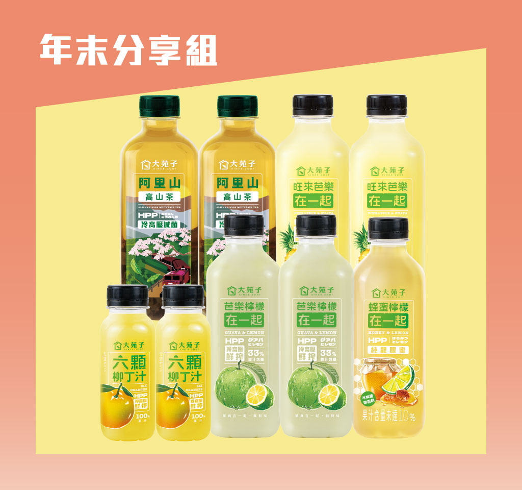 內含:芭樂檸檬在一起850mL x2、旺來芭樂在一起 850mLx2、蜂蜜檸檬在一起 850mLx1、阿里山高山茶850mL x2、六顆柳丁汁x2
