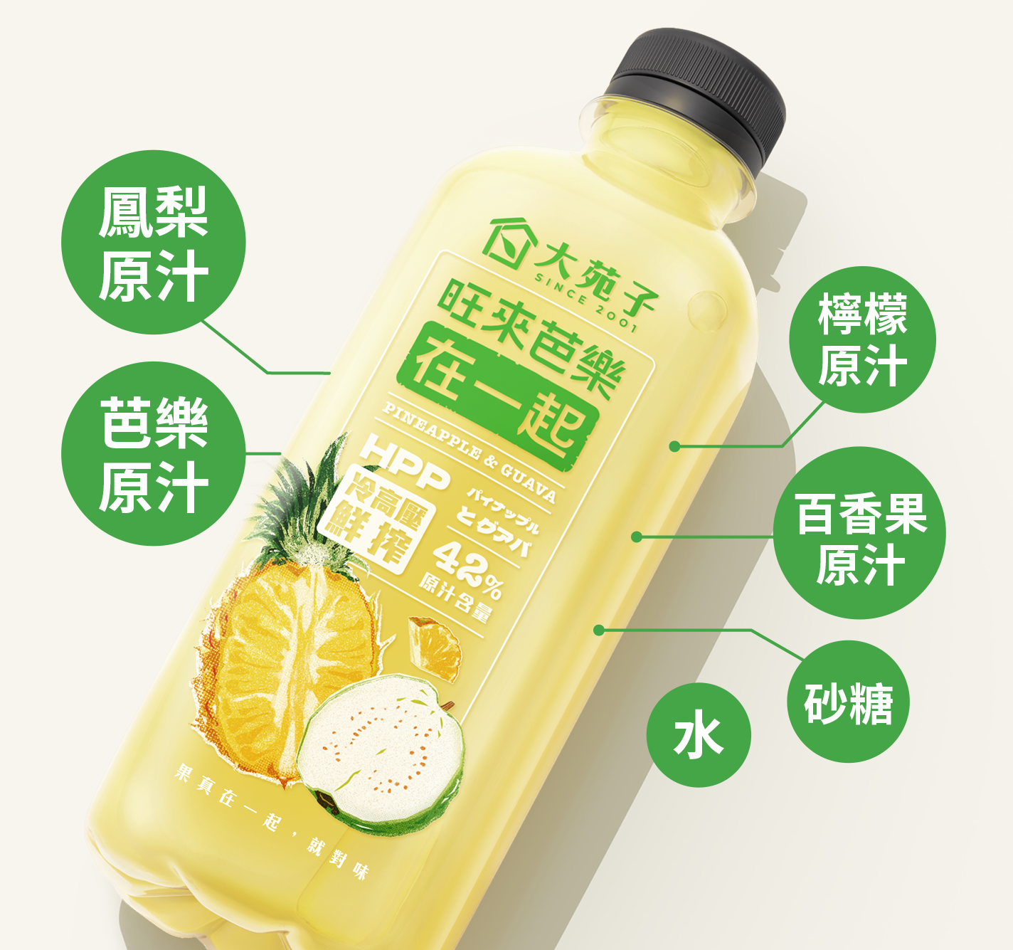 水、鳳梨原汁、芭樂原汁、砂糖、百香果原汁、檸檬原汁 |